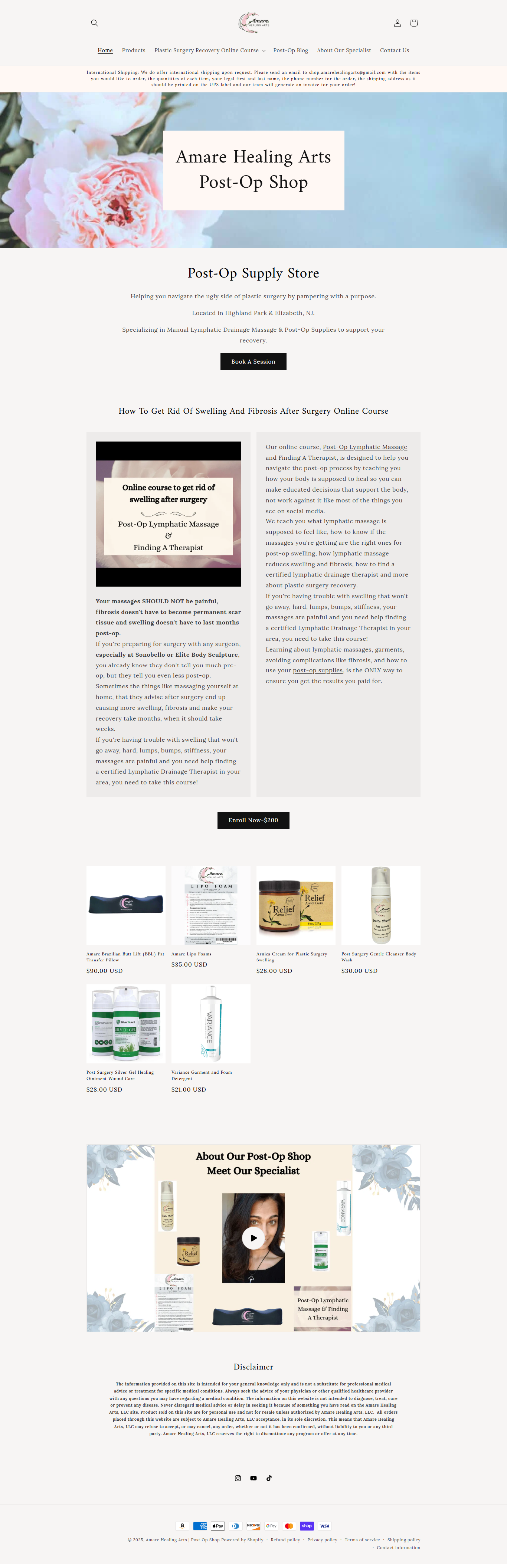 Amare Healing Arts Post-Op Shop specializes in plastic surgery recovery by offering Manual Lymphatic Drainage Massage services and essential post-operative supplies. Their expert team provides personalized care to help reduce swelling and fibrosis, ensuring a smoother healing process.For those seeking comprehensive guidance, Amare Healing Arts offers an online course titled "How To Get Rid Of Swelling And Fibrosis After Surgery." This course educates patients on effective recovery strategies, including proper massage techniques and finding certified therapists, empowering individuals to manage their post-operative care confidently.In addition to services and courses, Amare Healing Arts provides a range of post-op products designed to support recovery. Items such as the Amare Brazilian Butt Lift (BBL) Fat Transfer Pillow, Lipo Foams, and Arnica Cream are available to assist in reducing discomfort and promoting optimal healing after procedures like liposuction and BBL surgeries.
